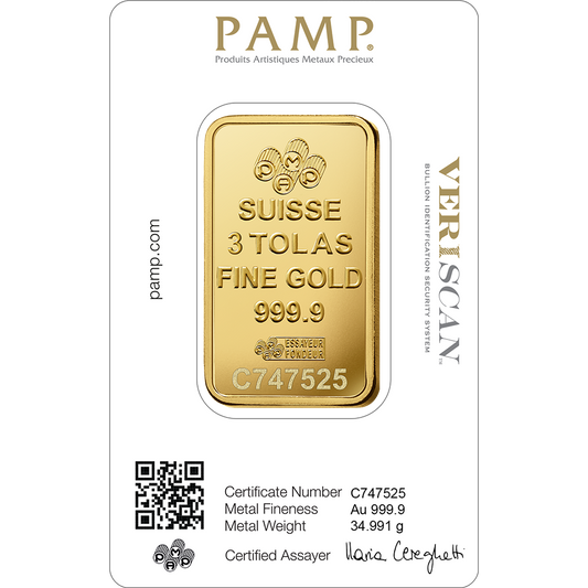 PAMP 3 Tola Gold 9999 Fortuna Minted Bar